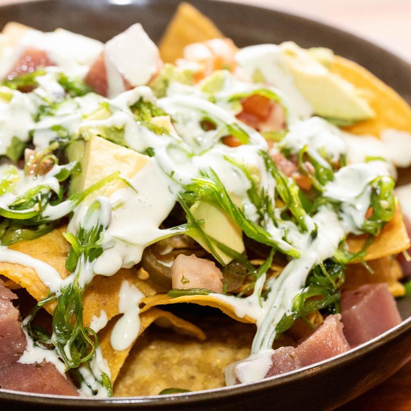 Marinated raw sashimi tuna, crispy corn tortillas seaweed salad, pico de gallo, avocado, sliced jalapenos wasabi aioli, micro cilantro.