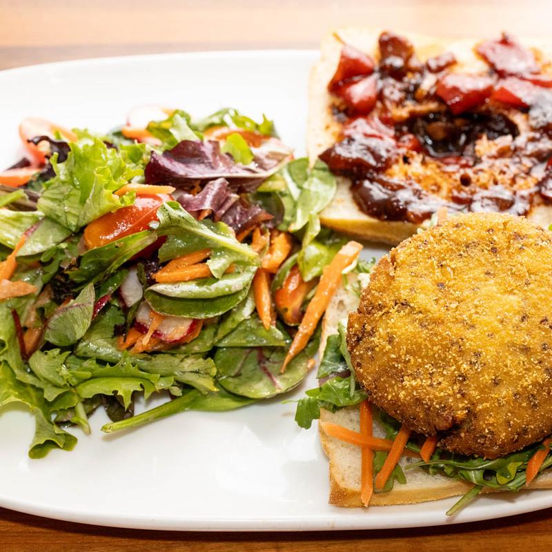 Tomato red pepper jam, arugula, pickled carrots brioche roll, side salad.