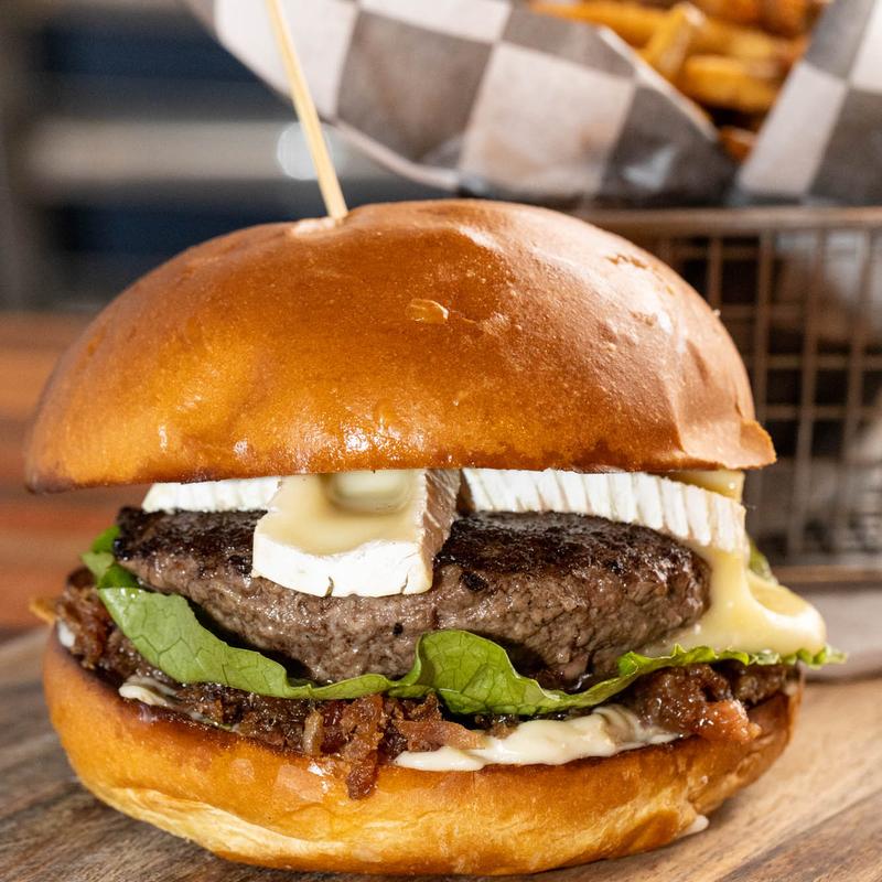 Black peppercorn bacon jam, melted brie cheese, apple aioli, brioche roll, hand cut fries.